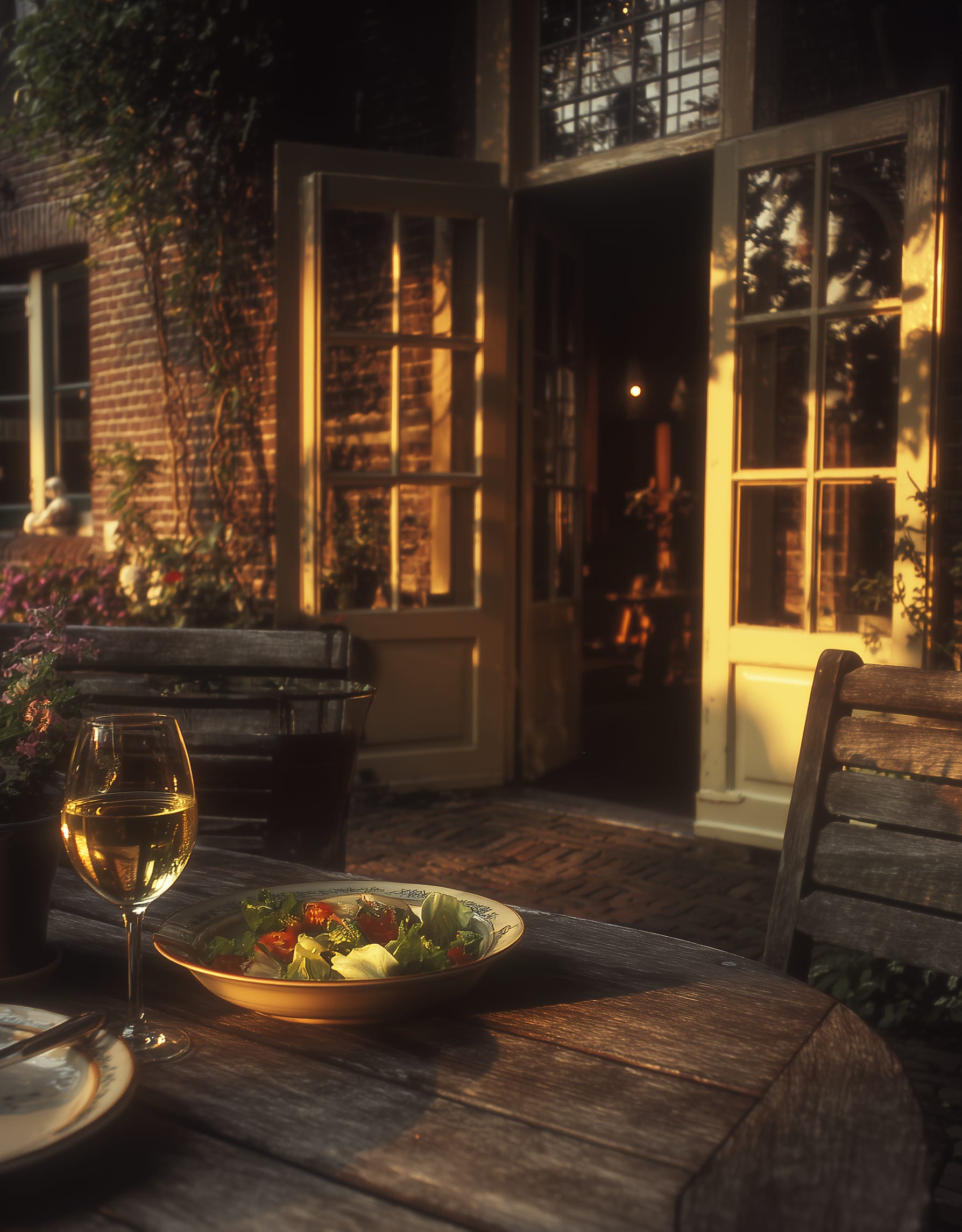 ‘En wil je ons al vertellen welke kleur? Wit, natuurlijk!’ lacht Irene. De schalen waar de rucolasalade en lauwwarme zalm op lagen zijn leeg maar nog steeds zwaar. Ze stapelt ze op elkaar en zet het lege mandje stokbrood er bovenop. ‘Laat maar staan die fles wijn. Komt wel op.’ Ze loopt door de openstaande deuren naar binnen, Charlotte komt achter haar aan. ‘Alex mag het niet horen; het gaat meer naar champagne dan wit.’